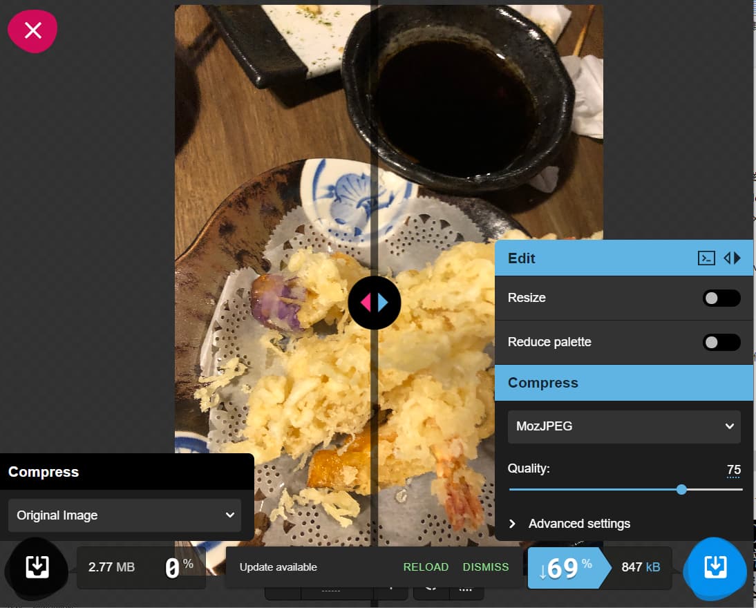 左邊是原始畫質的照片,右邊則是壓縮過後的照片。右下角是要保留品質的趴數,左右拖移中間的箭頭,來決定是否滿足壓縮後的照片。