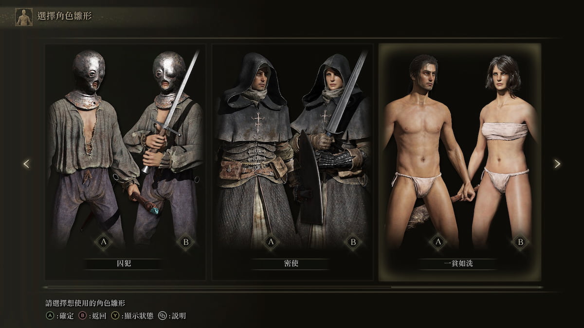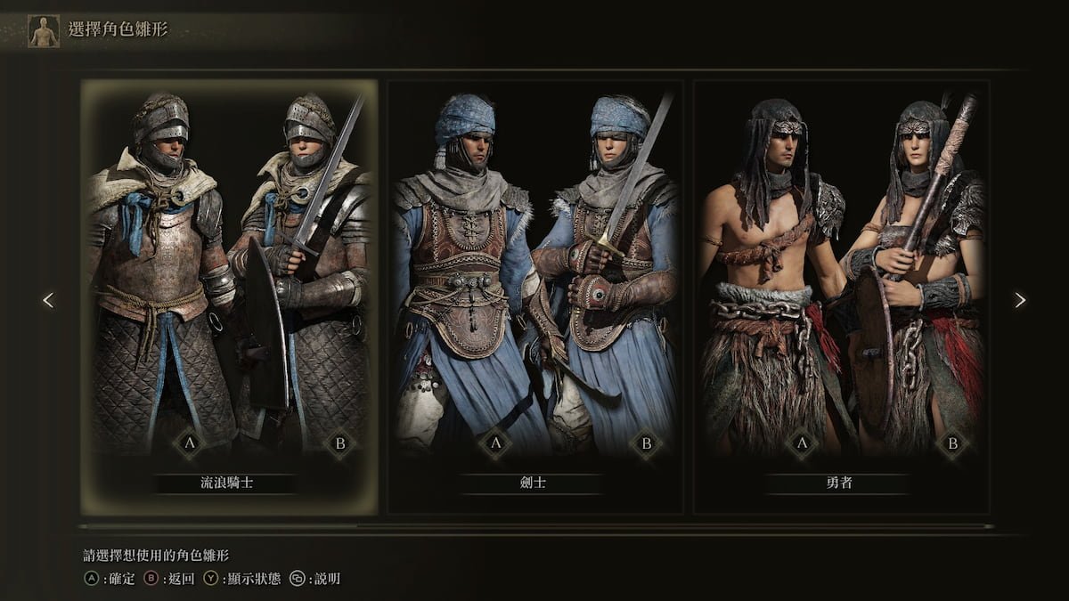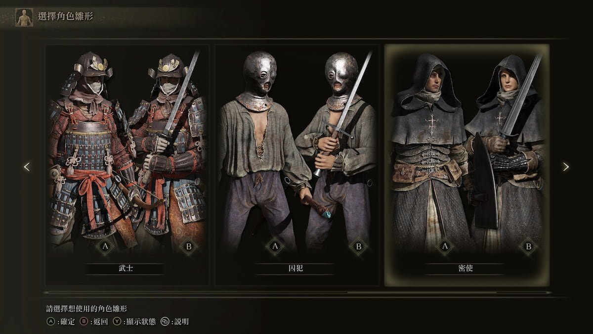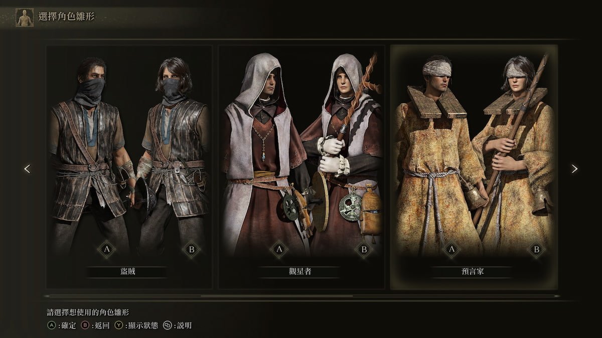 一開始創角色時有十個職業供選擇,分別是流浪騎士、劍士、勇者、盜賊、觀星者、預言家、武士、囚犯、密使、一貧如洗。