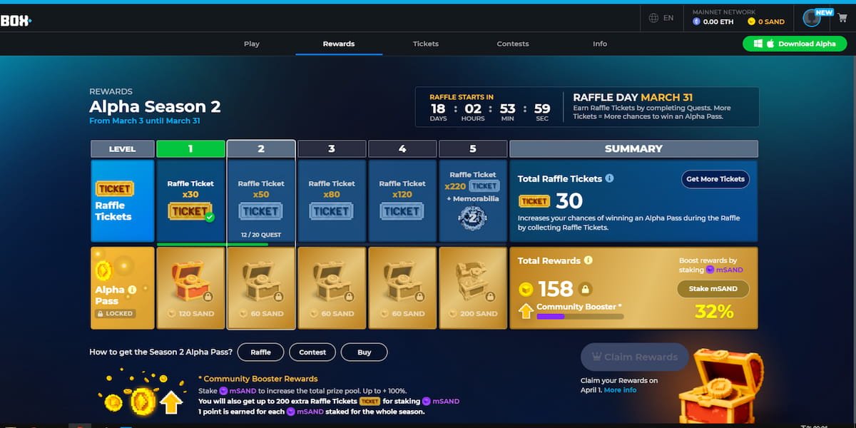 解任務數量共分為五個階段,每超過一個階段就會獲得指定數量的門票,這門票就是到時候Alpha封測結束後可以抽獎,官方講得有點模糊,只有提到最多抽到1000枚SAND幣而已。
