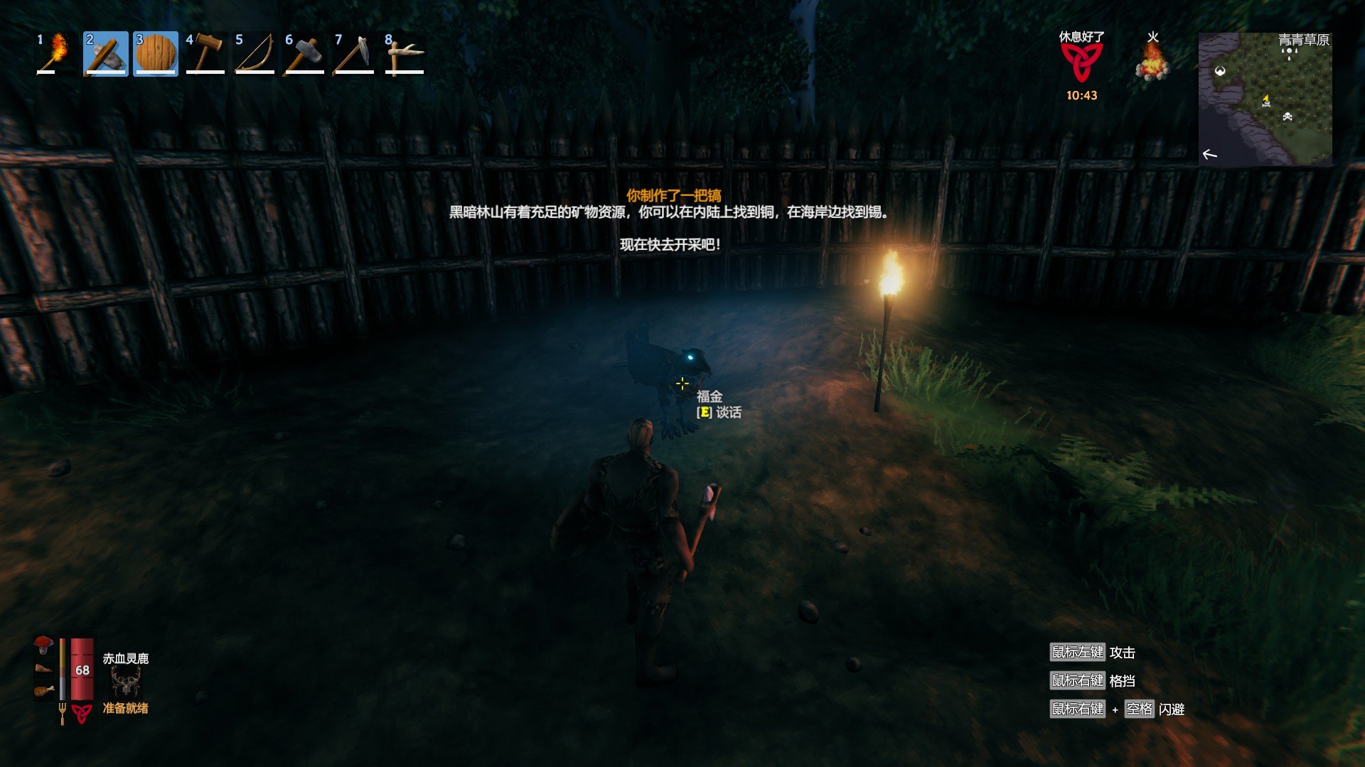 我把剛剛從赤血靈鹿身上掉落的硬鹿角做成一把鎬,福金又跑出來說黑暗林山會有礦物,可以去那裏採集。