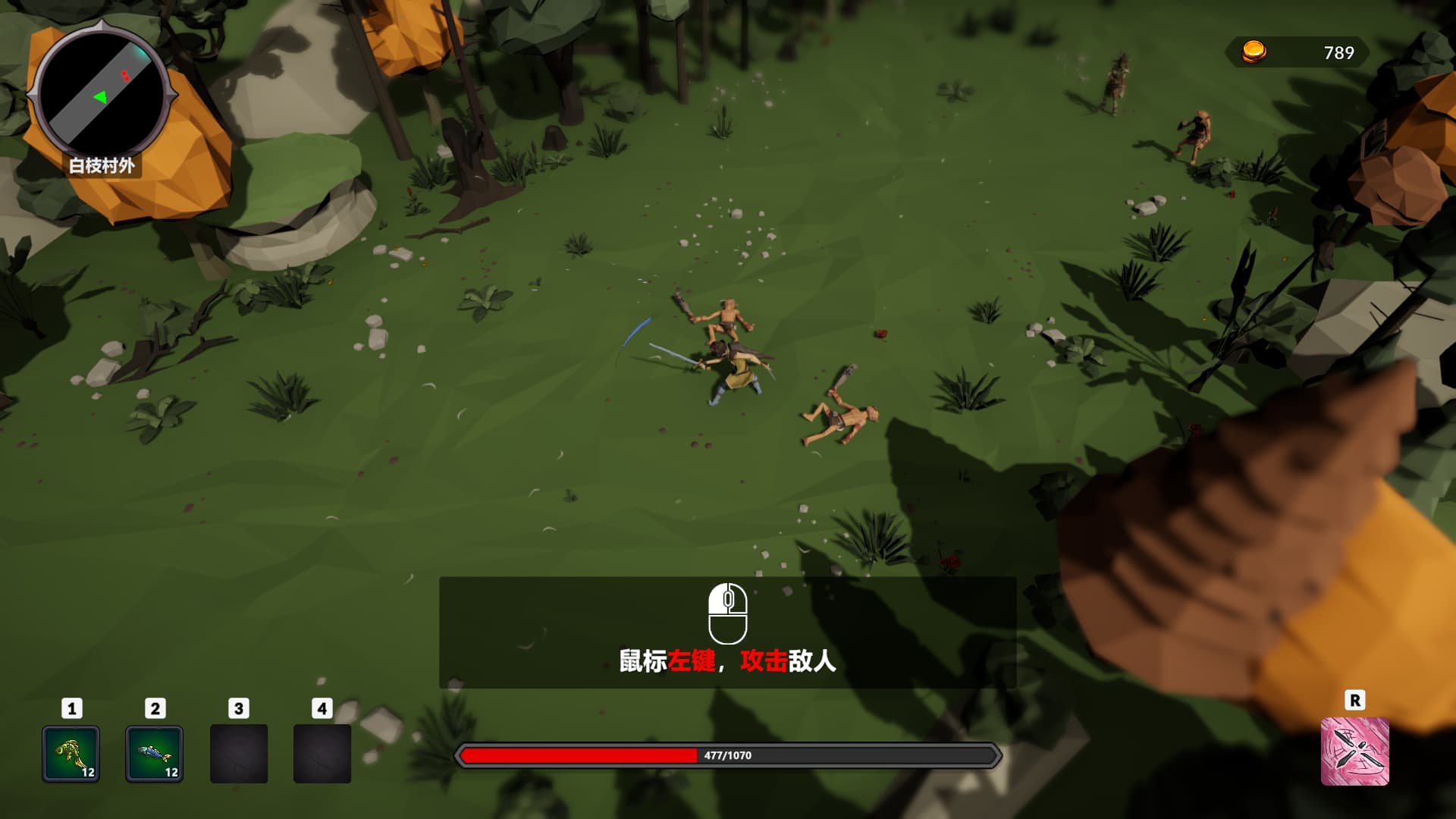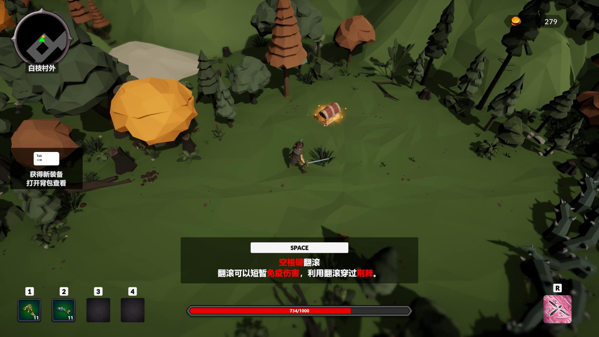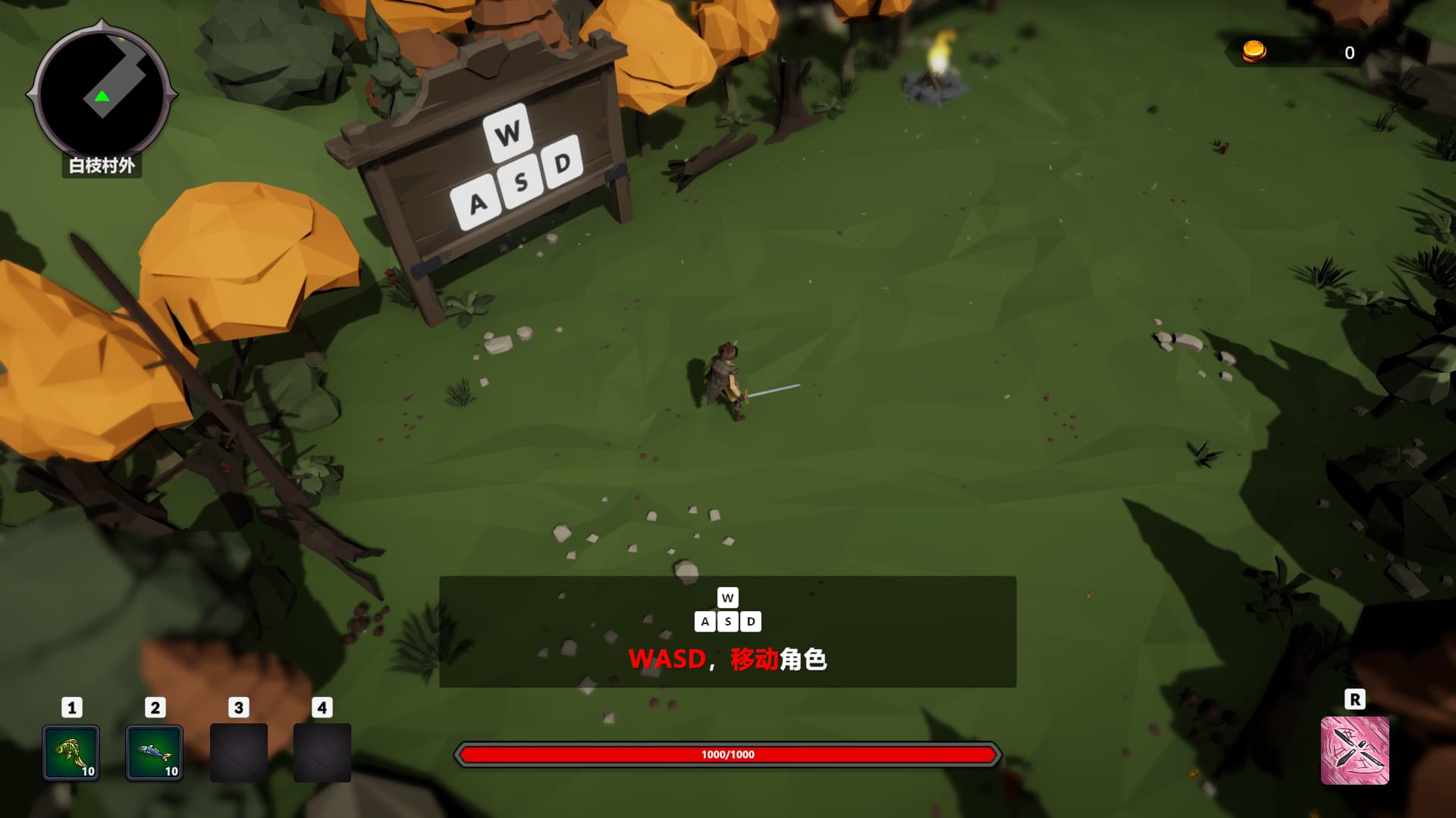 一開始有簡單的教學,包括WASD移動、空白鍵是翻滾,滑鼠左鍵是攻擊、鍵盤R跟F是發動技能。