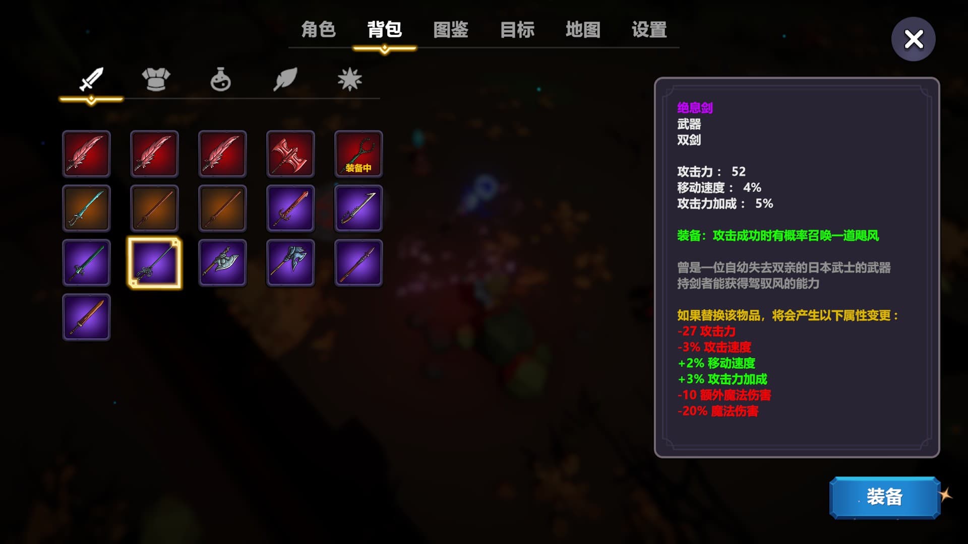在一路闖關的旅途中,怪物會掉落裝備和武器,武器大概分成雙手武器、雙刀流、單手劍、長槍等